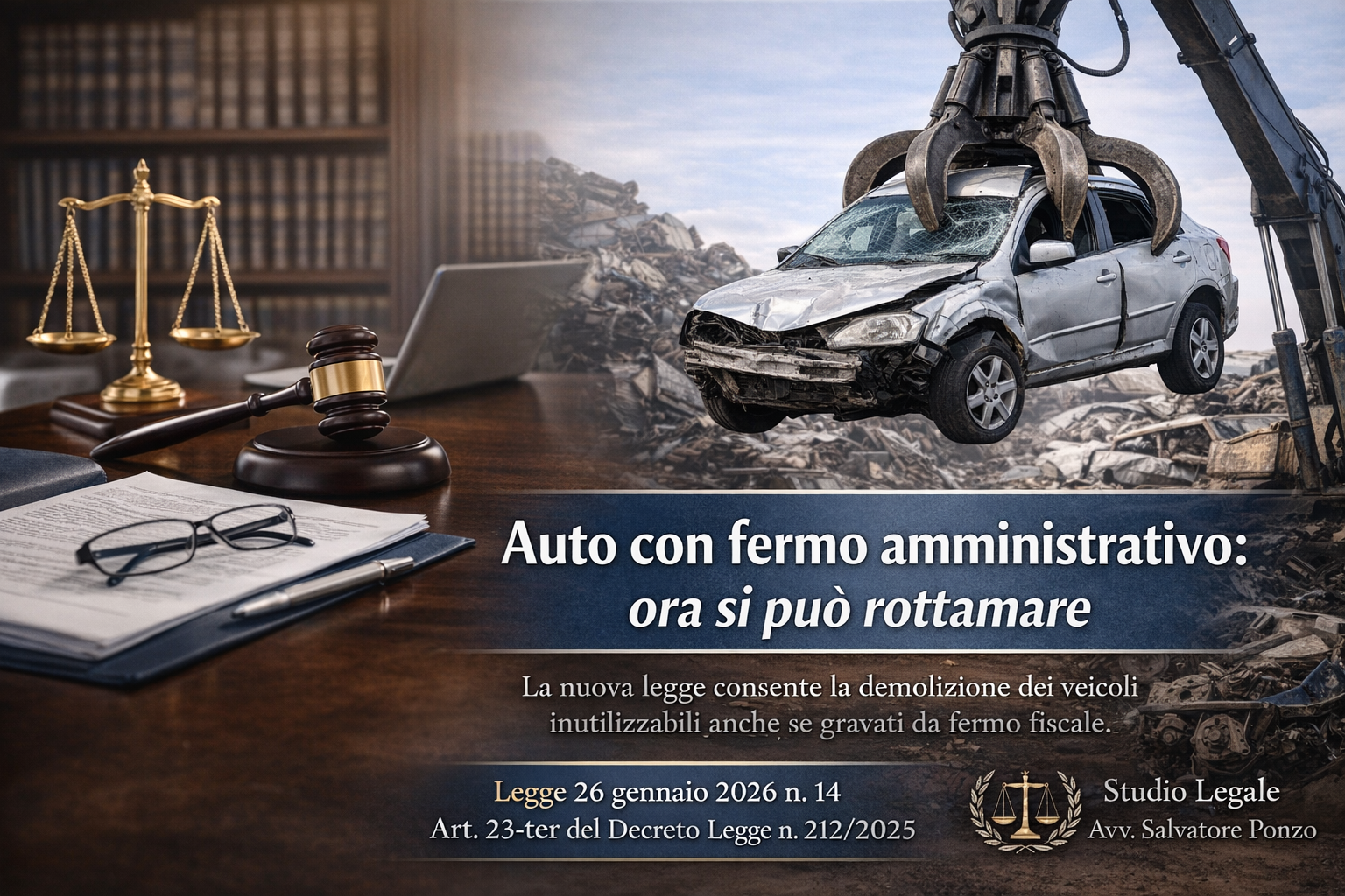 Negli ultimi anni molti proprietari di veicoli si sono trovati in una situazione paradossale: l'auto era ormai inutilizzabile o ridotta a rottame, ma il fermo amministrativo impediva la demolizione e la cancellazione dal Pubblico Registro Automobilistico. Con la Legge 26 gennaio 2026 n. 14, il legislatore ha introdotto una novità significativa: è ora possibile procedere alla rottamazione dei veicoli fuori uso anche in presenza di fermo amministrativo, purché siano rispettate precise condizioni.